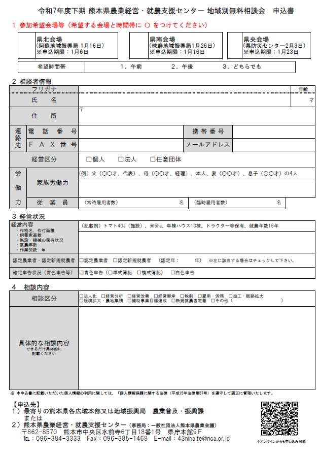 申込は、申込用紙をの広域本部(地域振興局)農業普及・振興課又は熊本県農業会議へ提出いただくか、上部の「地域別相談会申し込みフォーム」より必要事項を入力ください。